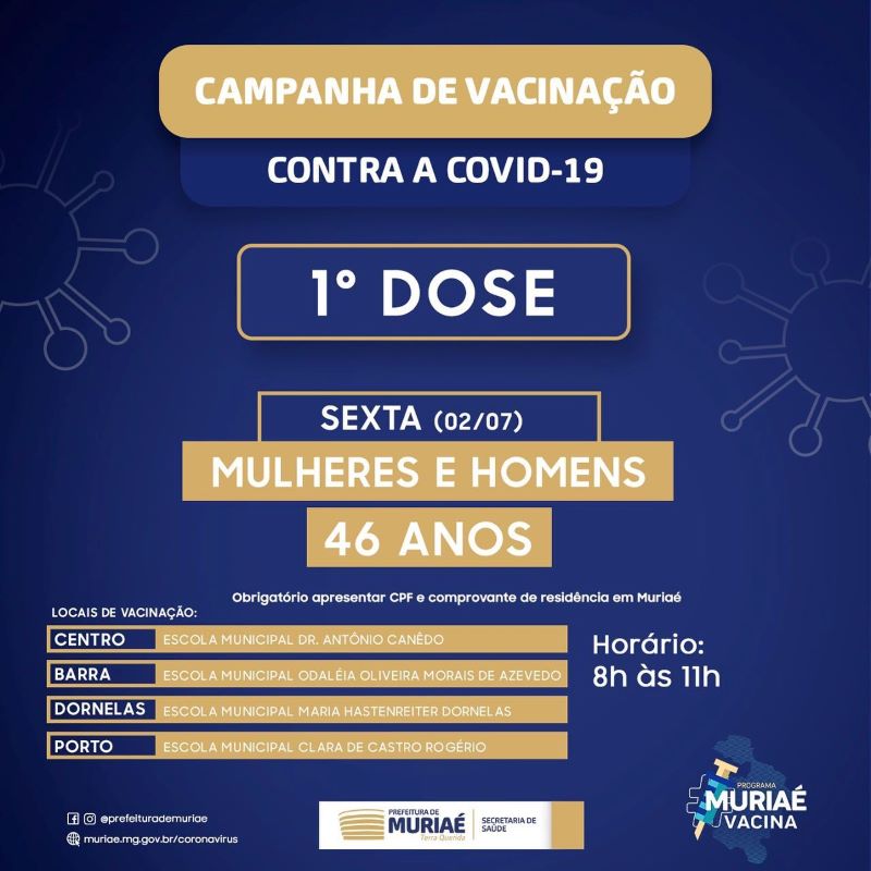 A vacinação contra a covid-19 segue avançando em Muriaé. Nesta sexta-feira (2), além de lactantes a partir de 18 anos, será a vez de pessoas com 46 anos receberem a primeira dose de imunizante.