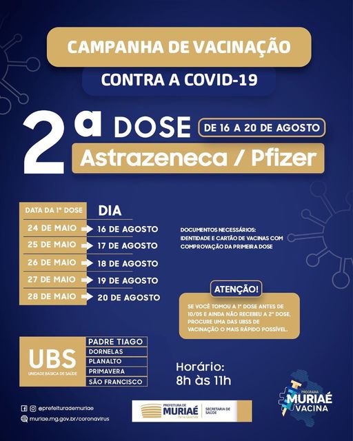 Muriaé terá vacinação de segunda dose da Astrazeneca e Pfizer nesta semana. O atendimento se dará nas Unidades Básicas de Saúde (UBS’s) dos bairros, Padre Tiago, Dornelas, Planalto, Primavera e São Francisco, de 8h às 11h.