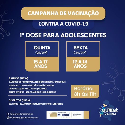 Muriaé dá início, nesta quinta-feira (23), à aplicação da primeira dose da vacina da Pfizer, contra a covid-19, para adolescentes, com ou sem comorbidades ou deficiências permanentes. O anúncio foi feito pela prefeitura, na tarde desta quarta (22).
