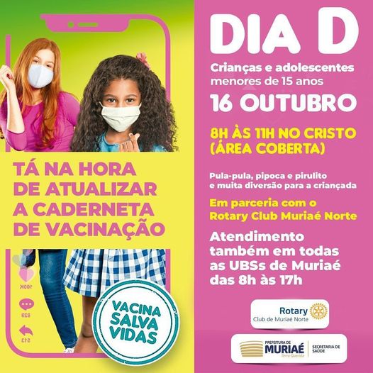O atendimento se dará em todas as Unidades Básicas de Saúde (UBS’s) do município, de 8h às 17h, e, em parceria com o Rotary Club Muriaé Norte, haverá vacinação também no complexo do Cristo Redentor, de 8h às 11h, com direito a pula-pula e distribuição de pipoca e pirulitos para a garotada.