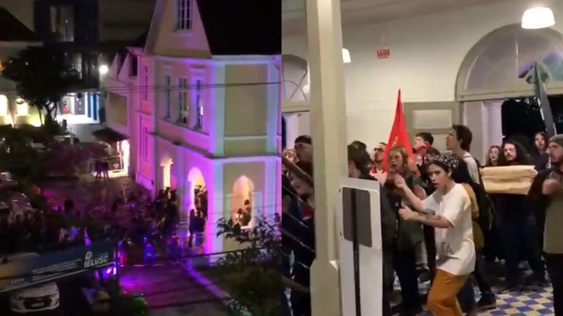 Manifestantes de esquerda invadiram o complexo onde funciona uma igreja luterana em Santa Catarina, noite de terça-feira (18), enquanto um culto estava em andamento.