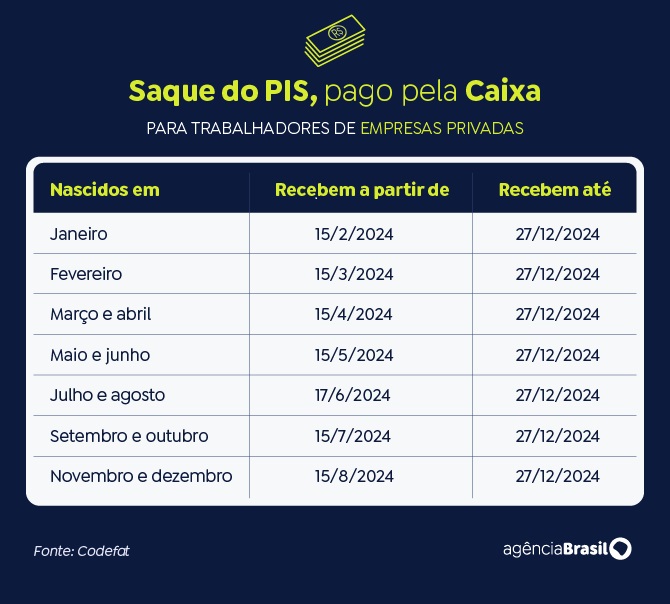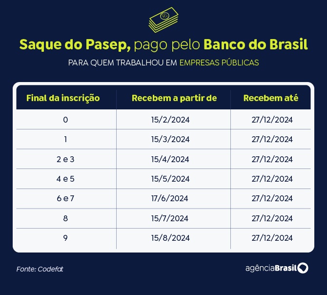 O PIS é pago pela Caixa Econômica Federal; e o Pasep, pelo Banco do Brasil. Como ocorre tradicionalmente, os pagamentos serão divididos em seis lotes, baseados no mês de nascimento, no caso do PIS, e no número final de inscrição, no caso do Pasep. O saque iniciará nas datas de liberação dos lotes e acabarão em 27 de dezembro de 2024. Após esse prazo, será necessário aguardar convocação especial do Ministério do Trabalho e Previdência.